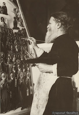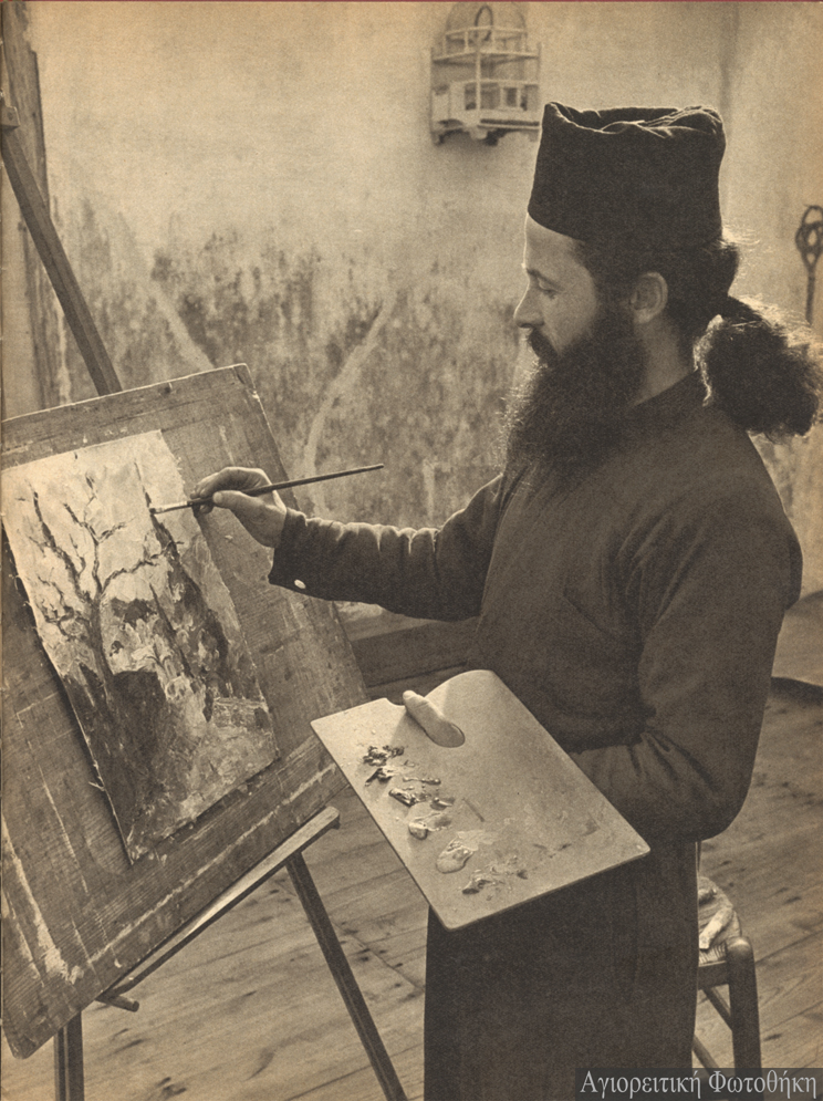 Ιωασαφαίοι ζωγράφοι των Καυσοκαλυβίων. Στο κέντρο ο γέροντας μοναχός Ιωάννης (1842-1926) (Φωτογραφία: εργαστήριο Ιωασαφαίων, αρχές 20ού αι.)