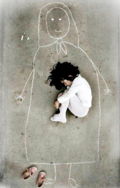 Η ιστορία αυτής της φωτογραφίας πονά και συγκλονίζει. Είναι η απώλεια της μητέρας, είναι ο πόνος του αποχωρισμού. Είναι μια πραγματική ιστορία μέσα από τα μάτια ενός παιδιού… Το κοριτσάκι αυτό έχασε τη μητέρα του στον πόλεμο. Πήγε στο ορφανοτροφείο για να μπορέσει να επιβιώσει. Στην αυλή του ορφανοτροφείου ζωγράφισε τη μητέρα της με κιμωλία και κουλουριάστηκε στην αγκαλιά της, όπως όταν ήταν έμβρυο.