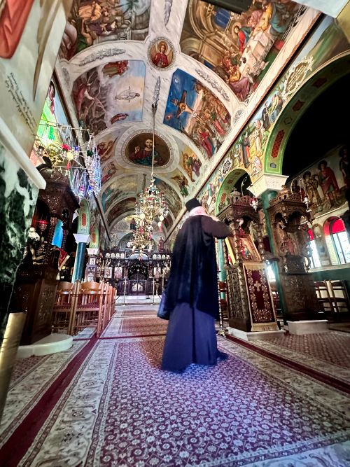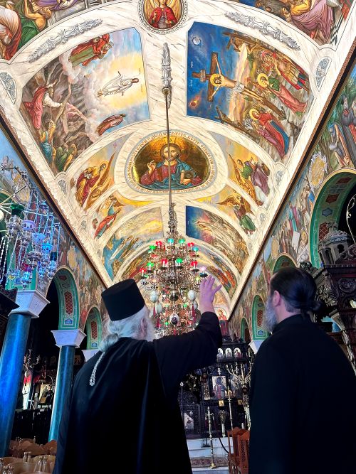 Ο Γέροντας Δωρόθεος που συνοδευόταν απο τον Ιερομόναχο π.Ανίκητο ευλόγησε ,θαύμασε και καμάρωσε το έργο της αγιογραφήσεως του Ναού μας,το περιεργάσθηκε σε όλες του τις λεπτομέρειες και ευχήθηκε για τους συνδρομιτές και δωρητές οι οποίοι συμβάλλουν στην ιερή αυτή διακονία ώστε ο Ναός να αποτελεί σέμνωμα για τους Ενορίτες ,την Ενορία και την πόλη μας.